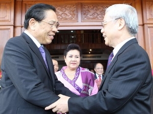 | Lao Party General Secretary and State President Choummaly Sayasone shakes hands with Vietnamese Party General Secretary Nguyen Phu Trong in Vientiane, 6/2011 |