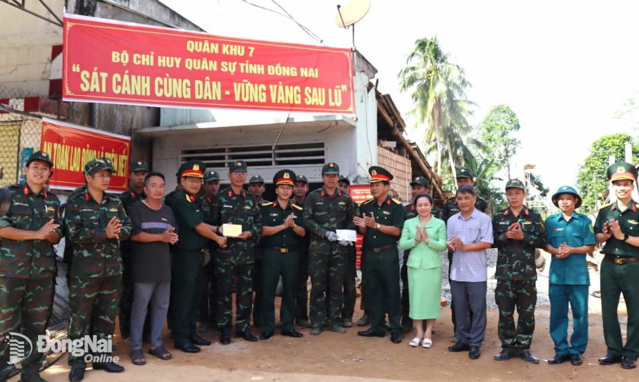 | Agencies under the Dong Nai Provincial Military Command present gifts to encourage officers and soldiers assisting people in building houses. Photo: Nguyet Ha. |