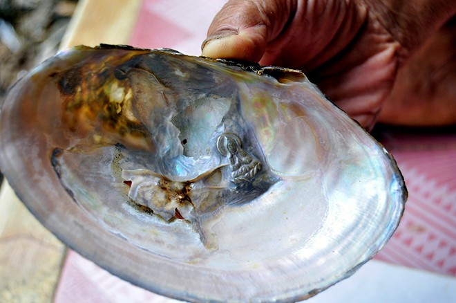 After perforating the mussels, Huong added objects with the desired shapes into them and used plastic to cover the holes. After a period of one to two years, mussels will release the pearl to enclose the foreign objects. Huong put Buddha, Maitreya and Jesus-shaped cement pieces into the mussels to collect pearls of the corresponding shapes. The mussels weighing 0.3 to 0.5 kg will be perforated on the shell to graft with at least two objects.