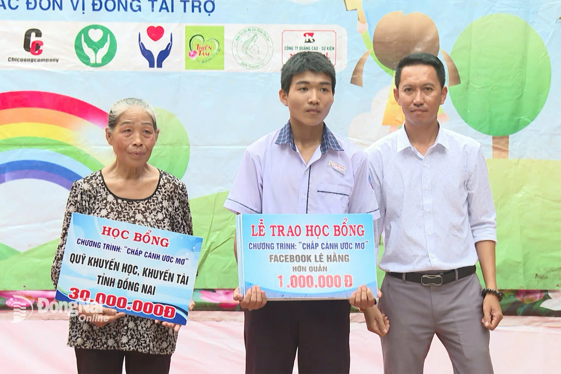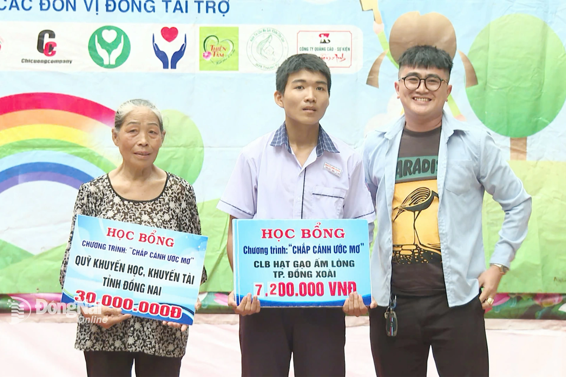 | The Hat Gao Nhan Ai Charity Club and the Criminal Judgment Execution and Judicial Assistance Division of Dong Nai Police present a VND 10 million scholarship to Thinh. Photo: Phu Quy |
