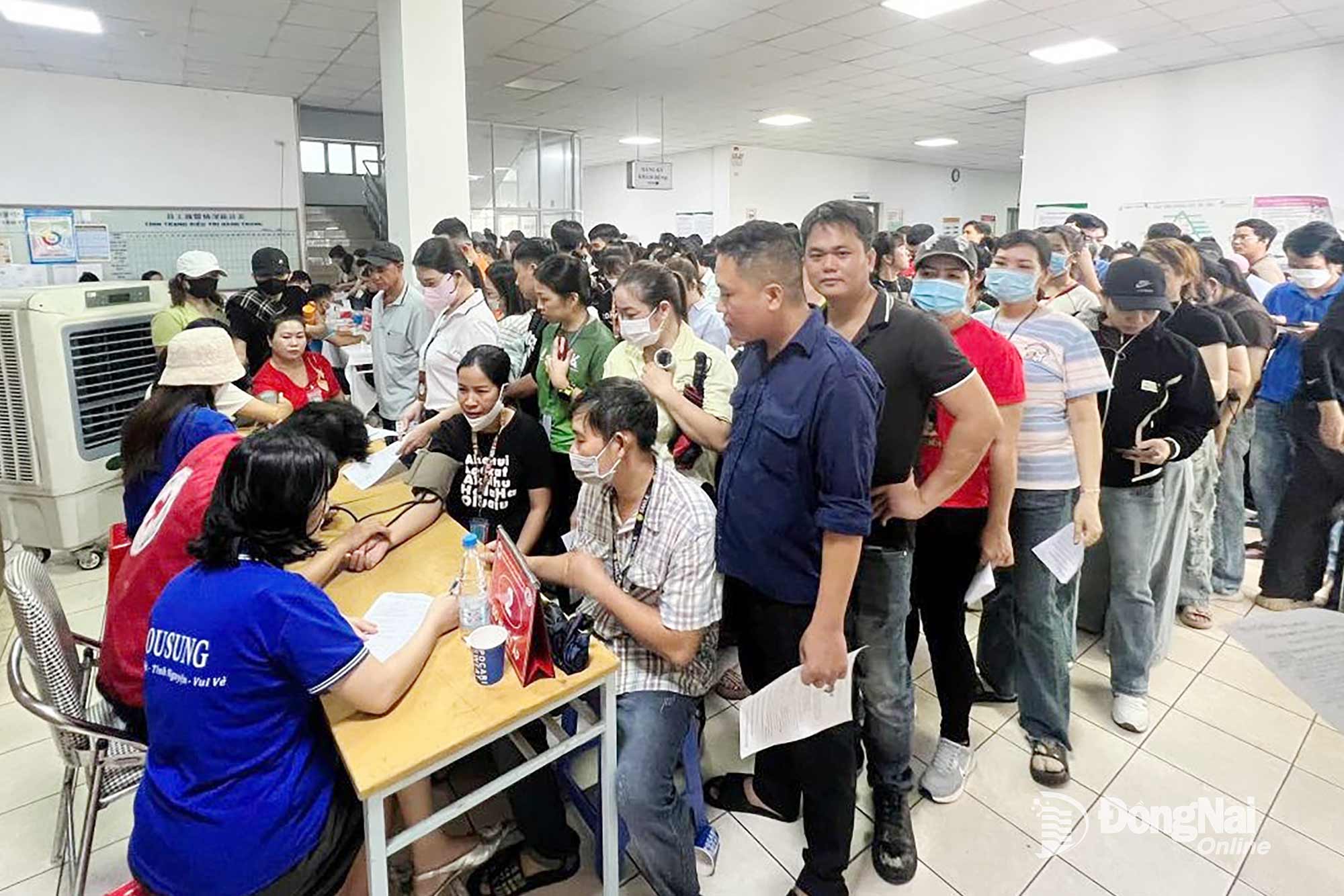 | Đông đảo người lao động xếp hàng khám sức khỏe để hiến máu tình nguyện. Ảnh: CĐCC |