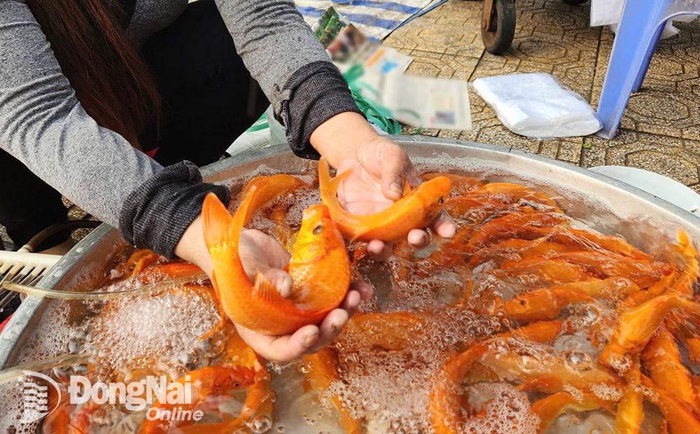| Cá chép vàng có giá từ 10-20 ngàn đồng/con tùy kích cỡ. Ảnh: Lam Phương |
