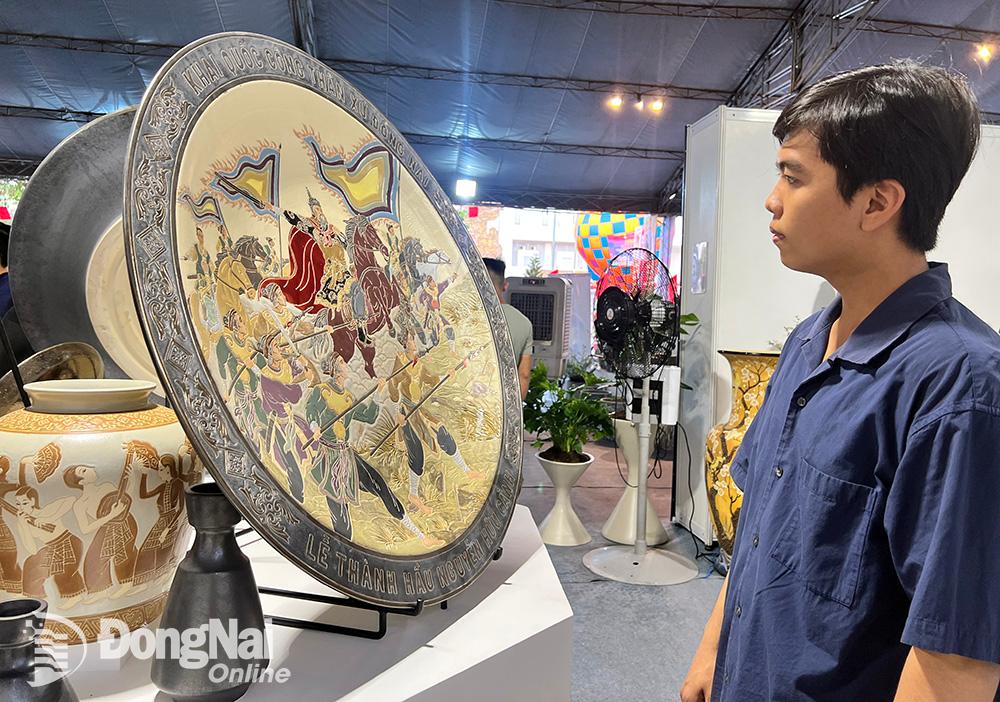 | Anh Đinh Chí Bảo (sinh viên ngành Sư phạm Tiếng Anh, Trường đại học Sài Gòn) ấn tượng với những sản phẩm gốm Biên Hòa, trong đó có các sản phẩm gốm đặc sắc thể hiện lịch sử lâu đời của vùng đất Biên Hòa - Đồng Nai. Ảnh: Hải Hà |