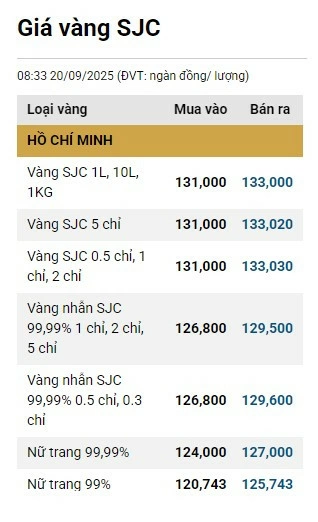 Tại Việt Nam, sáng 20-9, Công ty Vàng bạc Đá quý Sài Gòn niêm yết giá vàng SJC tại thị trường Hà Nội ở mức 130-132,00 triệu đồng/lượng (mua vào-bán ra).
