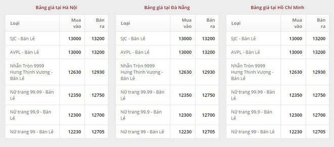 Giá vàng tại Công ty Trách nhiệm hữu hạn Một thành viên Vàng bạc Đá quý Sài Gòn (SJC):