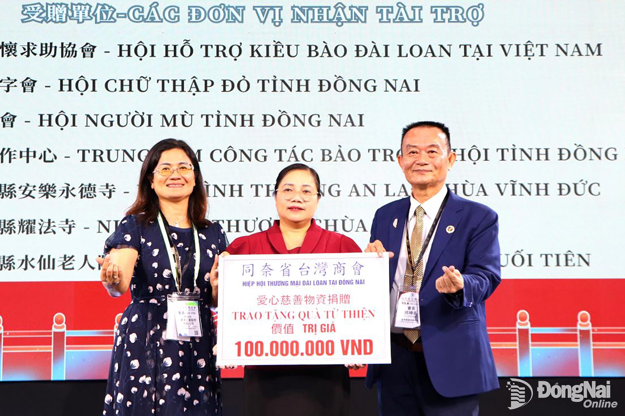 | Hiệp hội Thương mại Đài Loan tại Đồng Nai tặng quà từ thiện 100 triệu đồng đến Hội Chữ thập đỏ tỉnh Đồng Nai. Ảnh: Ngọc Liên |