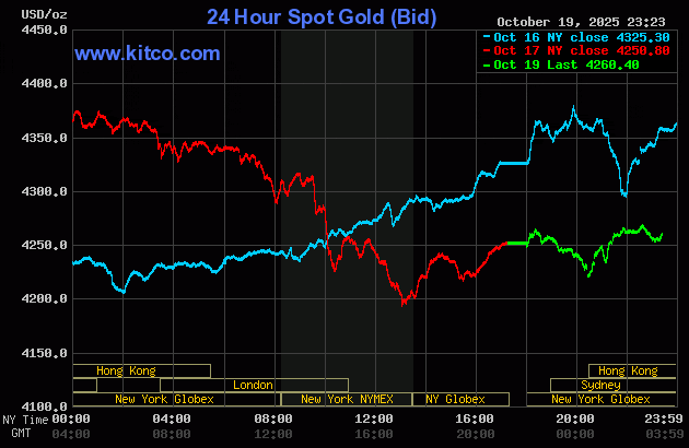 Tính đến 12 giờ ngày 20-10 (giờ Việt Nam), giá vàng thế giới tăng 9,6 USD so chốt phiên trước đó lên mức 4.260,4 USD/ounce.