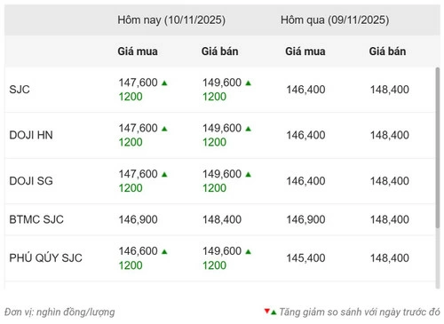 Cụ thể, tại thời điểm 8 giờ 40 phút ngày 10-11, Công ty Vàng bạc đá quý Sài Gòn (SJC) niêm yết giá vàng miếng SJC mua vào-bán ra ở mức 147,6-149,6 triệu đồng/lượng, tăng 1,2 triệu đồng so chốt phiên trước đó. Chênh lệch mua-bán 2 triệu đồng/lượng.