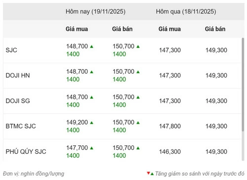 Cụ thể, tại thời điểm 10 giờ 30 phút ngày 19-11, Công ty Vàng bạc đá quý Sài Gòn (SJC) niêm yết giá vàng miếng SJC mua vào-bán ra ở mức 148,7-150,7 triệu đồng/lượng, tăng 1,4 triệu đồng/lượng so chốt phiên trước đó. Chênh lệch mua-bán 2 triệu đồng/lượng.