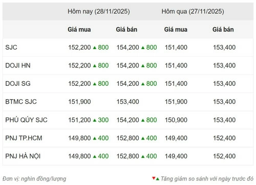 Cụ thể, tại thời điểm 9 giờ sáng 28-11, Công ty Vàng bạc đá quý Sài Gòn (SJC) niêm yết giá vàng miếng SJC mua vào-bán ra ở mức 152,2-154,2 triệu đồng/lượng, tăng 800.000 đồng so chốt phiên trước đó. Chênh lệch mua-bán 2 triệu đồng/lượng.