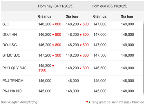 Cụ thể, tại thời điểm 11 giờ 30 phút ngày 4-11, Công ty Vàng bạc đá quý Sài Gòn (SJC) niêm yết giá vàng miếng SJC mua vào-bán ra ở mức 146,2-148,2 triệu đồng/lượng, giảm 800 nghìn đồng mỗi lượng ở cả chiều mua vào và chiều bán ra so chốt phiên hôm trước. Chênh lệch mua-bán ở mức 2 triệu đồng.