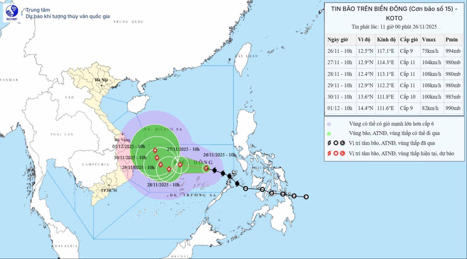 Cụ thể, hồi 10 giờ ngày 26-11, vị trí tâm bão ở vào khoảng 12,5 độ Vĩ Bắc; 117,1 độ Kinh Đông, cách đảo Song Tử Tây khoảng 330 km về phía Đông Đông Bắc. Sức gió mạnh nhất vùng gần tâm bão mạnh cấp 8 đến 9 (62 đến 88 km/h), giật cấp 11. Bão di chuyển theo hướng Tây Tây Bắc với tốc độ 20-25 km/h.