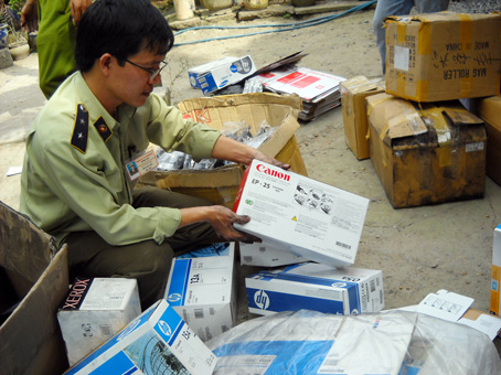 Bao bì và mực in giả các nhãn hiệu Canon, Samsung bị Quản lý thị trường tỉnh bắt giữ.