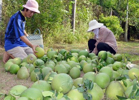 | Ông Nguyễn Văn Tươi ở ấp Vĩnh Hiệp, xã Tân Bình - Vĩnh Cửu thu hoạch bưởi. |