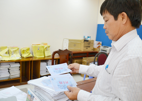 | Ông Nguyễn Thiên, Giám đốc Hợp tác xã dịch vụ vận tải Long Khánh nhận phù hiệu xe cho các xã viên. |
