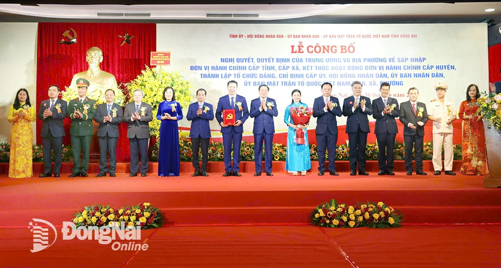 Sáng 30-6, Tỉnh ủy - HĐND - UBND - Ủy ban MTTQ Việt Nam tỉnh Đồng Nai trang trọng tổ chức Lễ công bố Nghị quyết, Quyết định của Trung ương và địa phương về sáp nhập đơn vị hành chính cấp tỉnh, cấp xã, kết thúc hoạt động đơn vị hành chính cấp huyện; thành lập tổ chức Đảng, chỉ định cấp ủy, HĐND, UBND, Ủy ban MTTQ Việt Nam tỉnh, xã, phường.