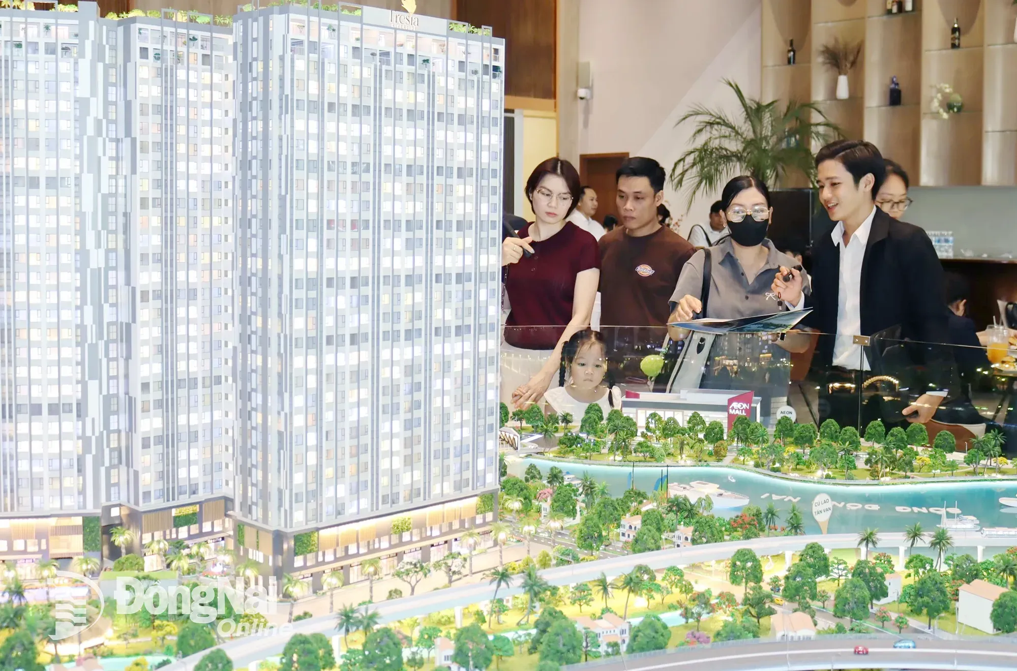 | Khách hàng xem mô hình Dự án Fresia Riverside. Ảnh: Hoàng Lộc |