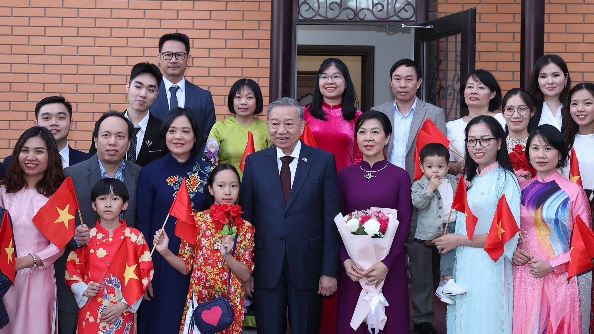 | Tổng Bí thư Tô Lâm và Phu nhân gặp gỡ cán bộ, nhân viên Đại sứ quán cùng đại diện cộng đồng người Việt Nam tại Liên bang Nga. (Ảnh: TTXVN) |