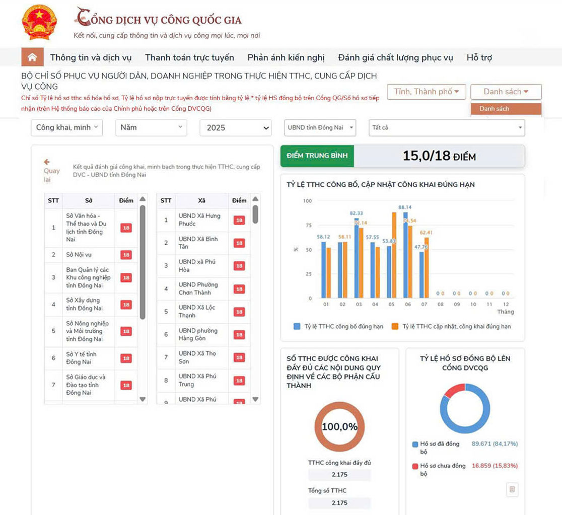 | Kết quả đánh giá công khai, minh bạch trong thực hiện thủ tục hành chính, cung cấp dịch vụ công của UBND tỉnh Đồng Nai trên Cổng Dịch vụ công quốc gia ngày 30-7-2025. Ảnh chụp màn hình: Hải Hà |