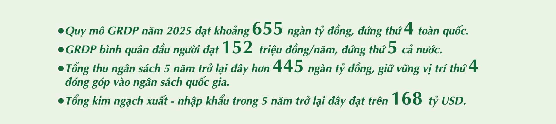 Tỉnh đang tập trung cao độ thực hiện “cuộc cách mạng” trên mặt trận kinh tế, với mục tiêu đạt tăng trưởng 2 con số và thu ngân sách 100 ngàn tỷ đồng trong năm 2025. Để đạt được mục tiêu này, lãnh đạo tỉnh đã áp dụng phương châm quản lý “6 rõ”: rõ người, rõ việc, rõ thẩm quyền, rõ trách nhiệm, rõ thời gian và rõ kết quả.