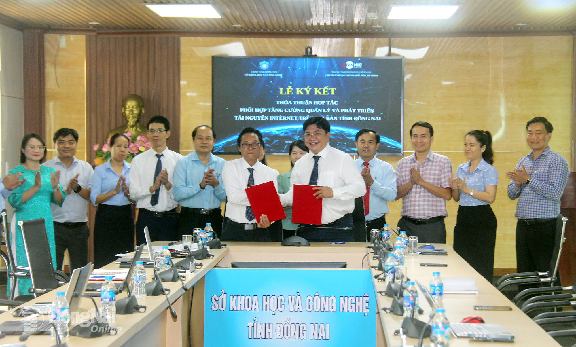 | Lãnh đạo Sở Khoa học và Công nghệ tỉnh Đồng Nai và Chi nhánh Trung tâm Internet Việt Nam tại Thành phố Hồ Chí Minh ký kết thỏa thuận hợp tác tăng cường quản lý và phát triển tài nguyên internet trên địa bàn tỉnh Đồng Nai vào tháng 8-2025. Ảnh: Hải Quân |