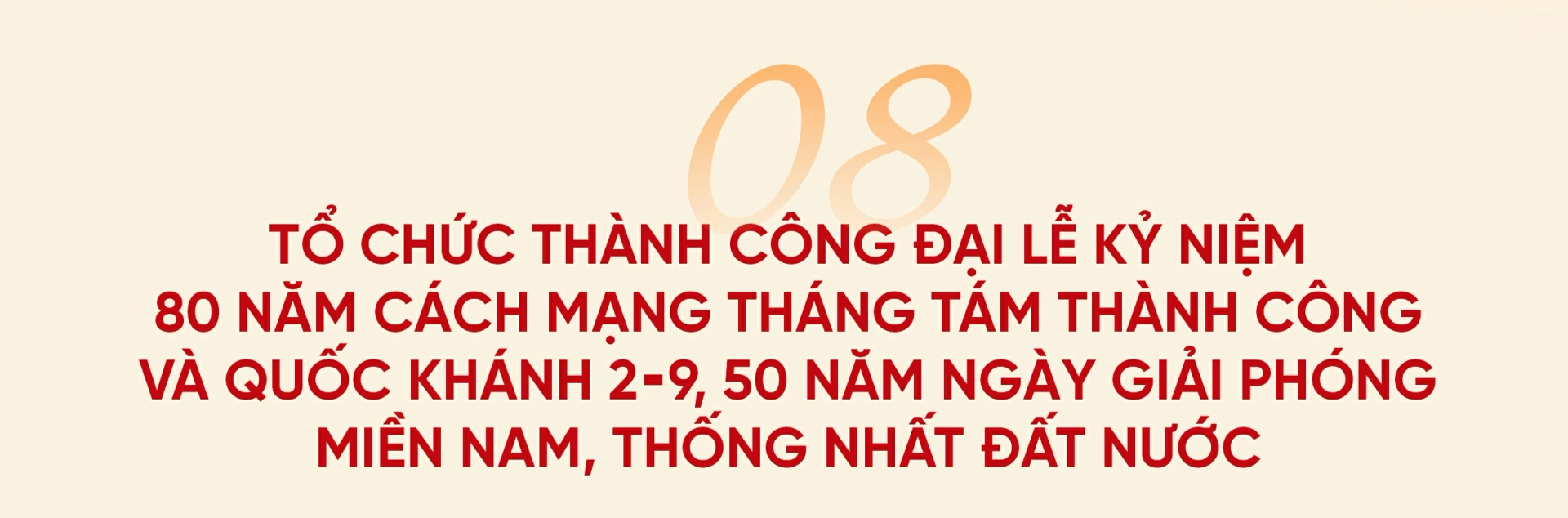 Hàng loạt sự kiện kỷ niệm trong năm 2025 đã được tổ chức thành công, trang trọng, đúng tầm vóc sự kiện và tuyệt đối an toàn. Trong đó, các hoạt động của 2 đại lễ kỷ niệm 80 năm Cách mạng Tháng Tám thành công và Quốc khánh 2-9; 50 năm Ngày Giải phóng miền Nam, thống nhất đất nước đã để lại dấu ấn chưa từng có. Lễ diễu binh, diễu hành trên Quảng trường Ba Đình sáng 2-9 ở Thủ đô Hà Nội và trên đường Lê Duẩn sáng 30-4 ở TP Hồ Chí Minh với hàng triệu người dân và các lực lượng vũ trang tham gia. Hình ảnh những đoàn diễu binh, diễu hành “đi giữa lòng nhân dân” không chỉ lan toả thông điệp sâu sắc về khát vọng độc lập, tự do, hoà bình, hữu nghị đến bạn bè quốc tế mà còn để lại niềm xúc động lớn lao về tinh thần tự tôn, tự hào dân tộc.