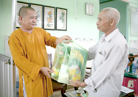 | Đại đức Thích Thiện Hưng tặng quà cho ông Nguyễn Xuân (76 tuổi, ngụ ấp Hưng Bình, xã Hưng Thịnh). |
