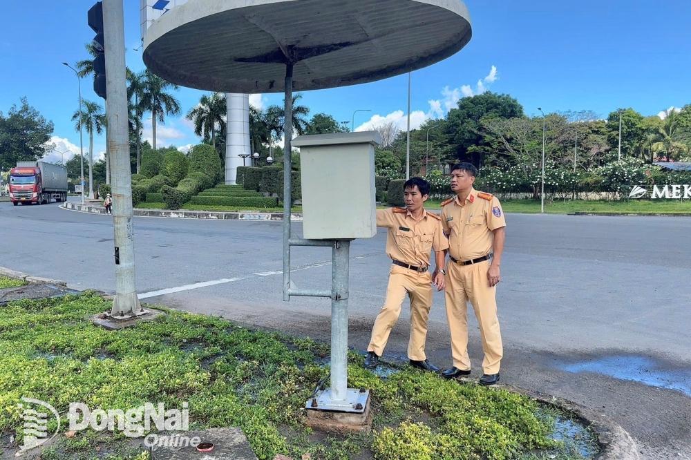 | Lãnh đạo Phòng Cảnh sát giao thông Công an tỉnh kiểm tra công tác vận hành hệ thống đèn tín hiệu giao thông của cảnh sát giao thông trên quốc lộ 51 (huyện Long Thành). Ảnh: Hoàng Lan |