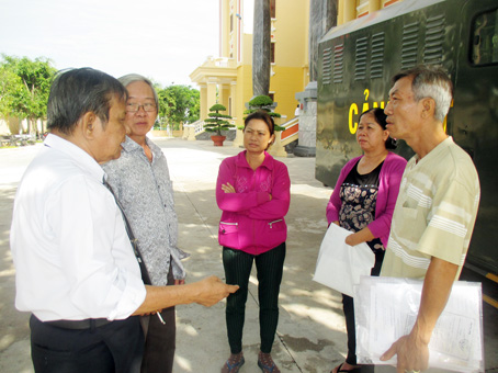 | Gia đình 2 ông Trẫn và Thúy đã nhờ luật sư Triệu Văn Long (bìa trái) bảo vệ quyền lợi tại tòa. |