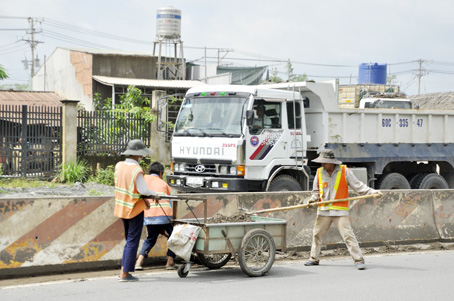 | “Bão” bụi và đất, đá do xe tải ben làm rơi xuống mặt đường khiến con đường trở nên nhếch nhác và gây ảnh hưởng đến việc lưu thông của người dân. |