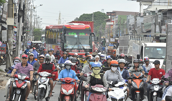 | Hàng trăm phương tiện nhích từng chút một trên quốc lộ 1 đoạn trước Bệnh viện đa khoa Thống Nhất (TP.Biên Hòa). |