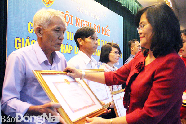 | Phó chủ tịch UBND tỉnh Nguyễn Hòa Hiệp tặng bằng khen cho các tập thể và cá nhân có thành tích xuất sắc trong triển khai Luật Hòa giải ở cơ sở. Ảnh: Đ.Phú |