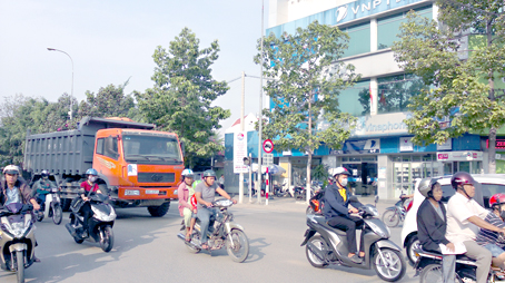 | Xe tải ben chạy trên đường có lượng xe máy qua lại đông gây nguy hiểm. |