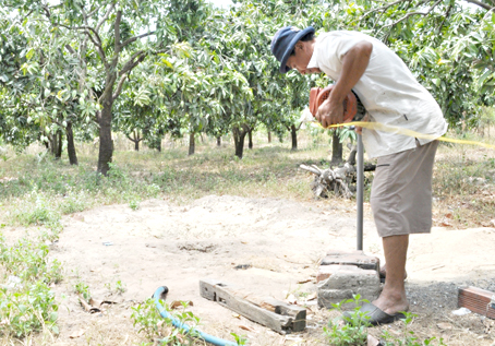 Nếu không tìm được nguồn nước mới để tưới dưỡng sức sau thời gian thu hoạch vừa rồi thì vườn xoài của gia đình ông Phạm Văn Sỉnh (ngụ tổ 17, ấp 2, xã Xuân Hòa) có nguy cơ không kịp ra hoa trong mùa tới. Vườn ông Sỉnh trồng chủ yếu giống xoài cát Hòa Lộc, loại cây vốn phải được chăm sóc cẩn thận, nước tưới phải đầy đủ. Những chiếc máy bơm nước nằm lăn lóc khắp nơi đang chờ chắt chiu từng giọt nước cuối cùng để cứu hạn cho vườn xoài.