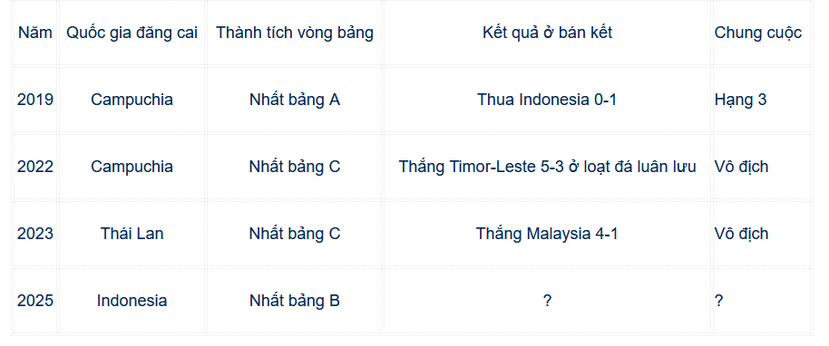 Việt Nam luôn vượt qua vòng bảng trong 4 lần góp mặt ở Giải vô địch U.23 ĐNA, với thống kê cụ thể như sau: