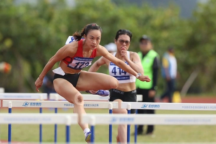 | Vận động viên Huỳnh Thị Mỹ Tiên (Đồng Nai) vẫn giành chiến thắng ở nội dung 100m rào. Ảnh: TTO |