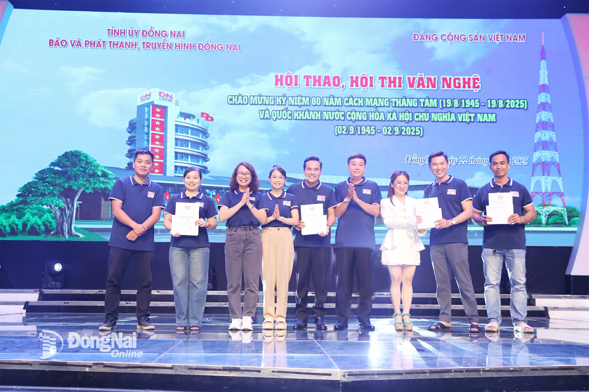 | Ban Biên tập tặng hoa cho các đội tham dự Hội thao, hội thi văn nghệ Báo và Phát thanh, Truyền hình Đồng Nai. Ảnh: Huy Anh |