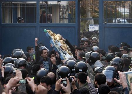 | Người biểu tình dỡ biểu tượng của sứ quán Anh |