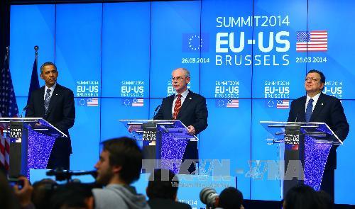 | Lãnh đạo Mỹ và EU trong một phiên thảo luận biện pháp trừng phạt Nga. (Nguồn: THX/TTXVN) |