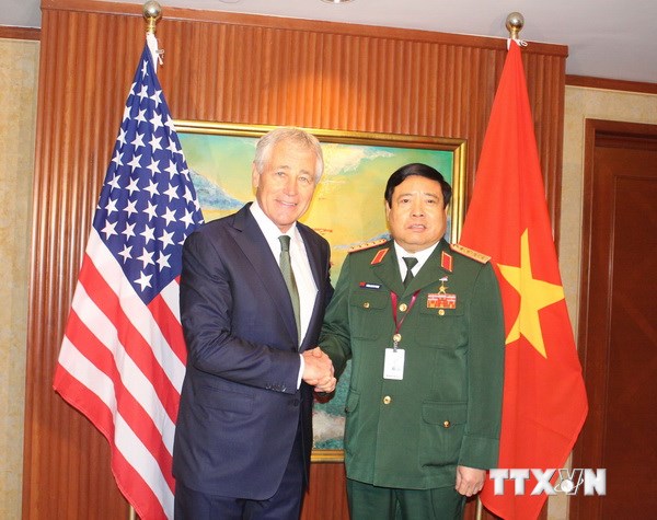 | Đại tướng Phùng Quang Thanh, Bộ trưởng Bộ Quốc phòng Việt Nam và Bộ trưởng Quốc phòng Mỹ Chuck Hagel. (Ảnh: TTXVN) |