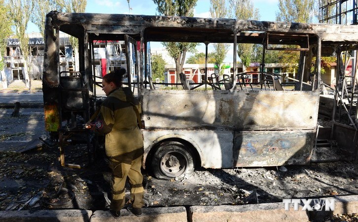 | Một chiếc xe buýt bị thiêu rụi sau loạt đạn pháo tại Donetsk ngày 1/10. (Nguồn: AFP/TTXVN) |