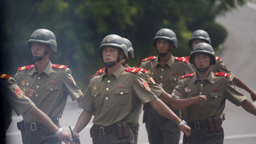 Binh sĩ Triều Tiên tuần tra làng Panmunjom ở biên giới với Hàn Quốc hôm 11/8. Ảnh: Reuters |