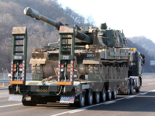 | Bích kích pháo của Hàn Quốc được triển khai ở thành phố biên giới Paju, gần Khu phi quân sự (DMZ) giữa hai miền, ngày 8/1. (Nguồn: YONHAP/TTXVN) |