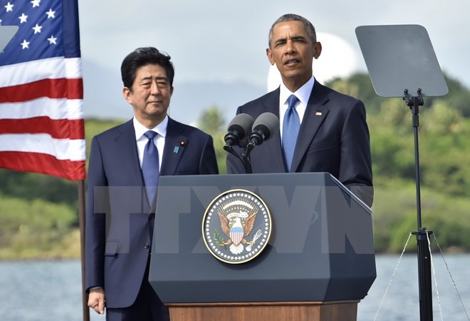 | Thủ tướng Nhật Bản Shinzo Abe (trái) đã có cuộc gặp mang ý nghĩa biểu tượng với Tổng thống Mỹ Barack Obama (phải) tại Hawaii (Mỹ). (Nguồn: AFP/TTXVN) |
