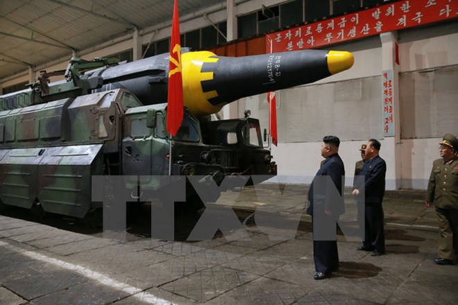 | Nhà lãnh đạo Triều Tiên Kim Jong-un (phía trước) kiểm tra loại tên lửa đạn đạo đất đối đất tầm trung Hwasong-12 ngày 15/4. (Nguồn: Yonhap/TTXVN) |