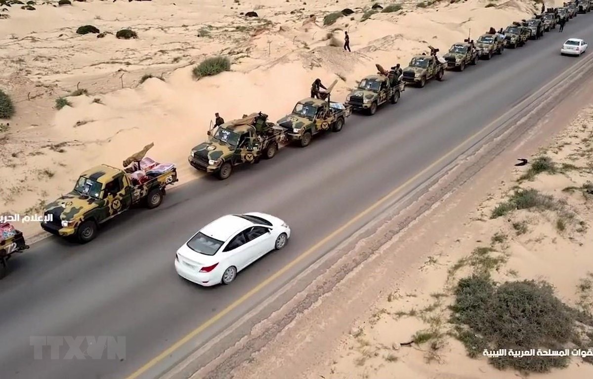 | Đoàn xe quân sự thuộc Lực lượng Quân đội Quốc gia Libya do Tướng Khalifa Haftar đứng đầu tiến về miền Tây Libya và thủ đô Tripoli ngày 3-4-2019. (Ảnh: AFP/TTXVN) |