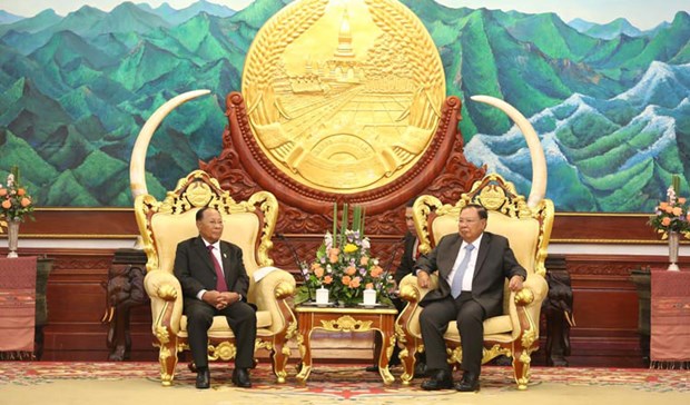 | Chủ tịch Quốc hội Campuchia Samdech Heng Samrin tiếp Tổng Bí thư Đảng Nhân dân Cách mạng, Chủ tịch Lào Bounnhang Vorachith. (Nguồn: Khmer Times) |