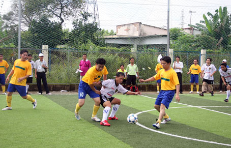 Bóng đá là một trong 2 môn được tổ chức thi đấu sớm. Trong ảnh: Trận Báo Ðồng Nai (áo trắng) thua Huyện ủy Nhơn Trạch 0-1.