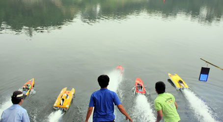 Đua tàu mô hình trên hồ Long Vân. Ảnh: A.T