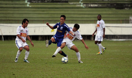| Đội Đồng Nai (áo trắng) thất bại trên chấm 11m trước K.Khánh Hòa. Ảnh: H.Anh |